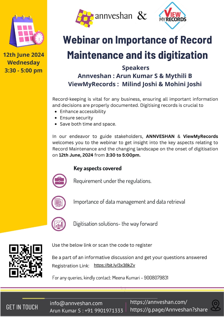 We cordially invite you to a webinar on the importance of record maintenance and its digitization. We will cover aspects such as regulatory requirements related to record keeping, the importance of data management and retrieval, and digitization solutions for these tasks. Please circulate this invitation among your groups for everyone to benefit.